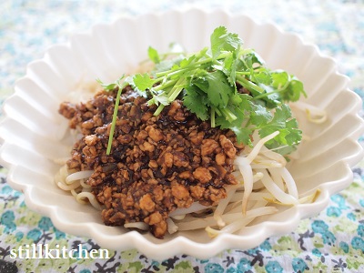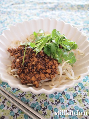 4.茹であがったらざるに取り、水で〆て器に盛りもやし、キュウリ、肉みそ、パクチーを添える