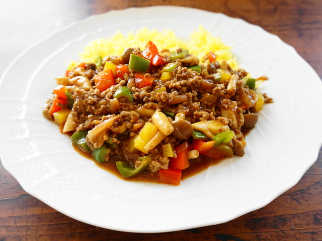 2.香りが出たら合い挽きミンチを炒めお好みでスパイスを加え炒めたら1㎝角に切った野菜を加える