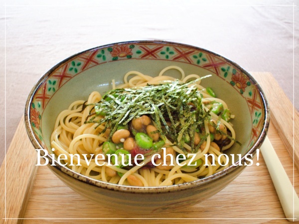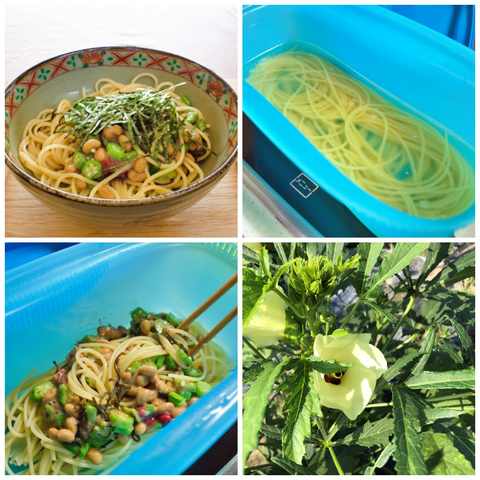 2.ゆでオクラを刻んで納豆添付のしょう油と梅干しと混ぜ合わせる、塩昆布も加えてよく混ぜ茹で上がったパスタと混ぜる